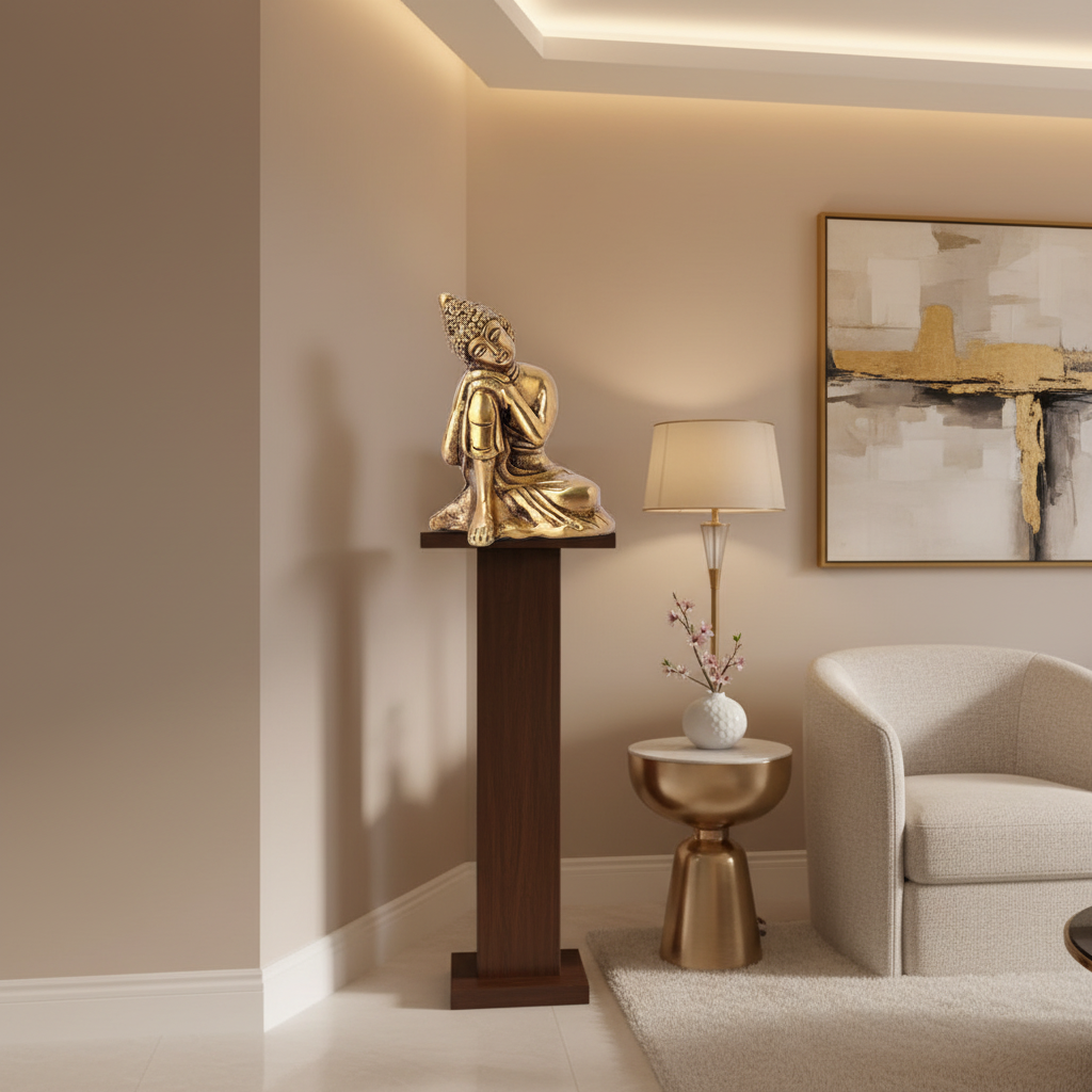 Handcrafted brass Buddha statue in a restful pose, symbolizing contemplation and spiritual harmony. This thoughtfully designed piece cultivates a tranquil atmosphere, fostering mindfulness and emotional equilibrium. Suited for meditation chambers, prayer rooms, and refined interior spaces seeking contemplative energy.