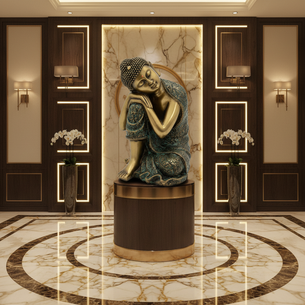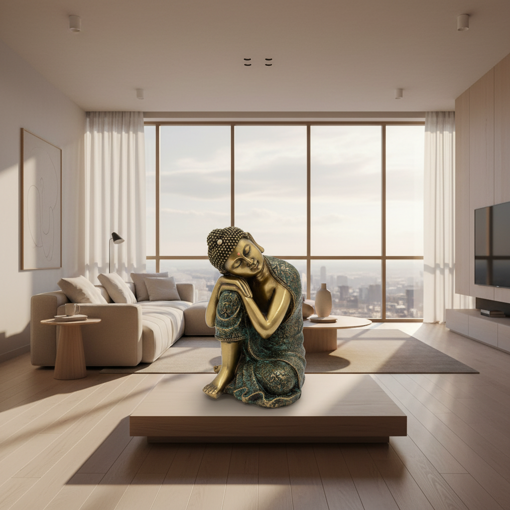 This Brass Resting Buddha on Knee statue beautifully represents the essence of Buddhist meditation and inner peace. As seen in the image, Lord Buddha is depicted in a resting posture with his head gently placed on the knee, symbolizing deep contemplation, mental clarity, and emotional calm. This posture reflects the peaceful state achieved through meditation and self-awareness.
