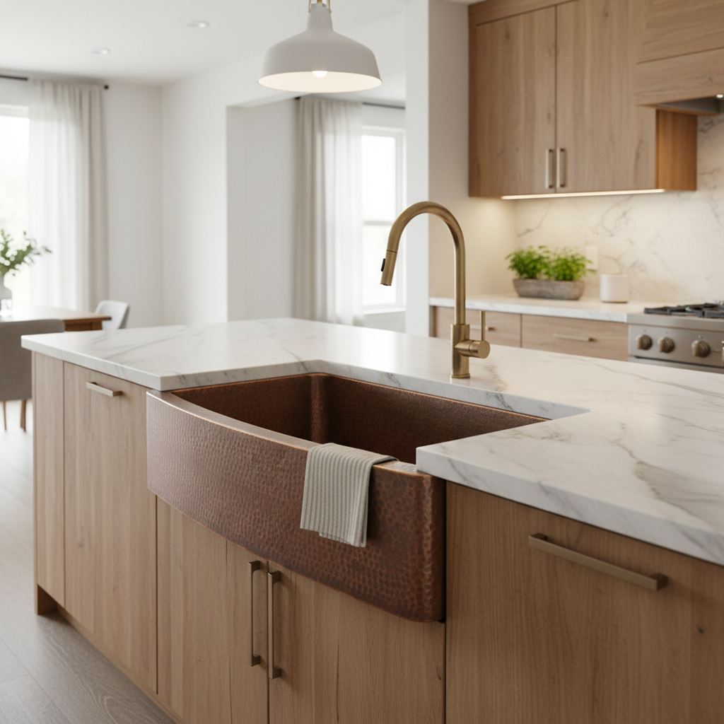 • Farmhouse apron-front copper kitchen sink
