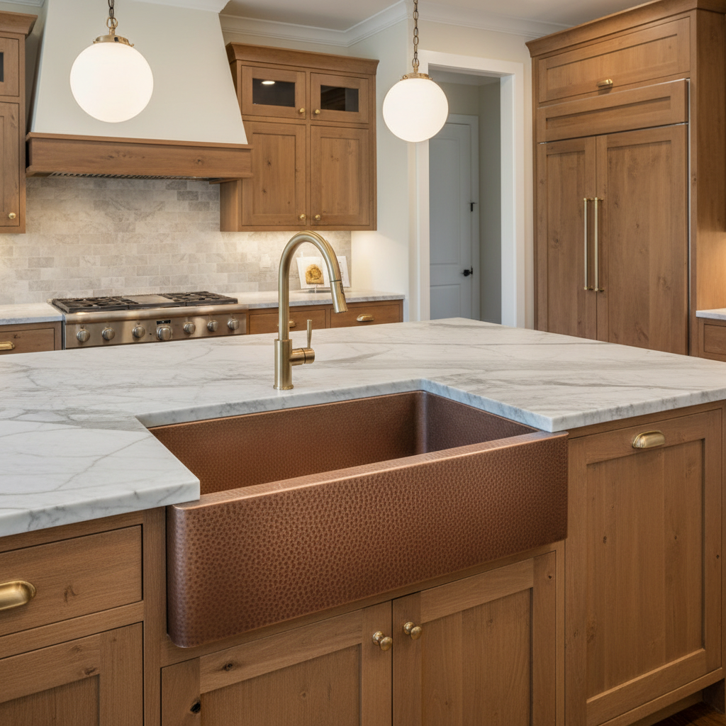 • Farmhouse-style copper kitchen sink with antique finish