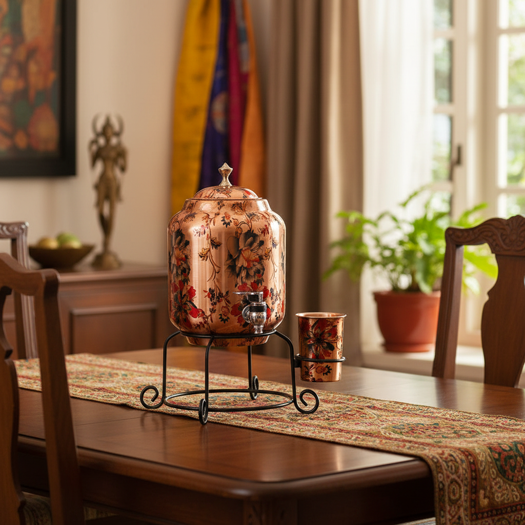 The set includes one matching copper glass and a durable metal stand, allowing easy dispensing while elevating the look of your dining or kitchen area. Its artistic floral design and premium craftsmanship also make it a thoughtful gifting option for weddings, housewarmings, festivals, and special occasions.