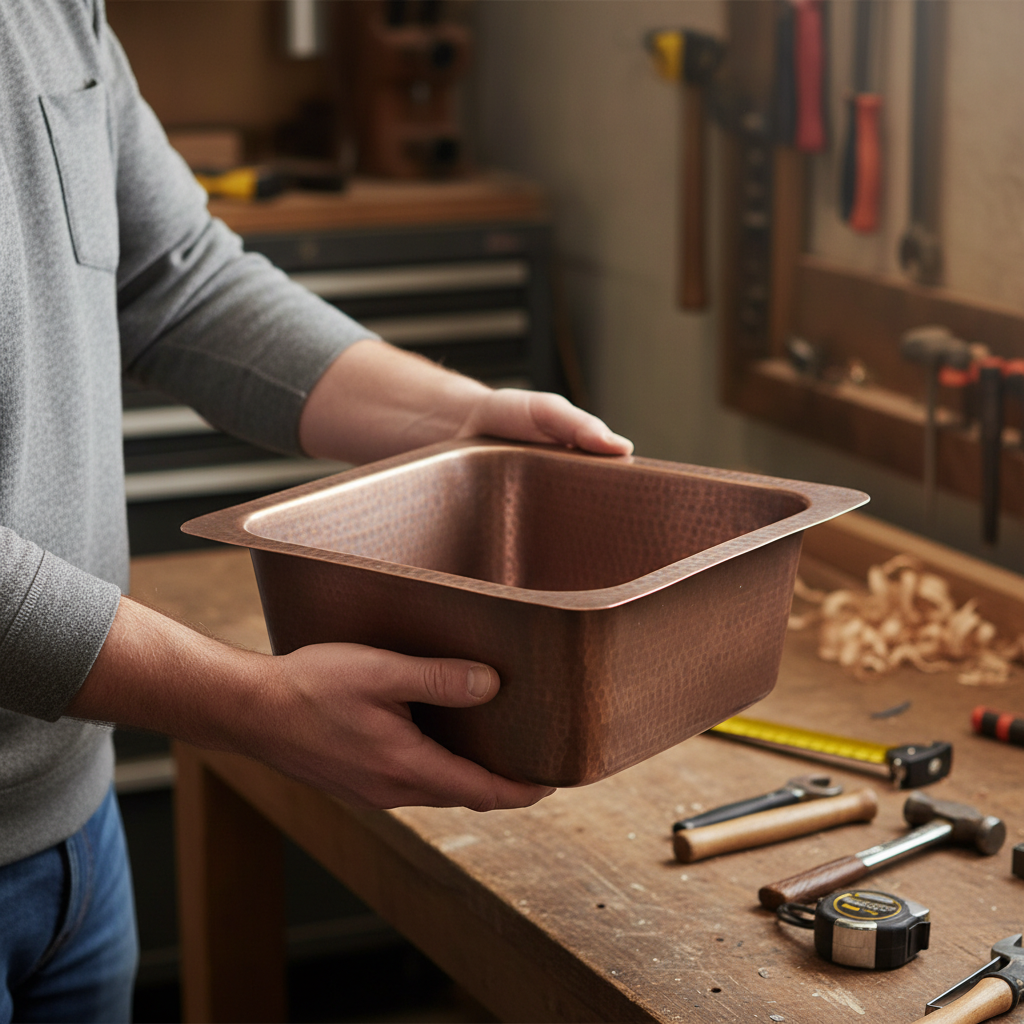Compact copper kitchen sink, 14-inch with 16-gauge pure copper construction. Ideal for limited spaces while maintaining full functionality and natural antimicrobial properties. Handcrafted design delivers timeless elegance without compromising on durability or hygiene standards.
